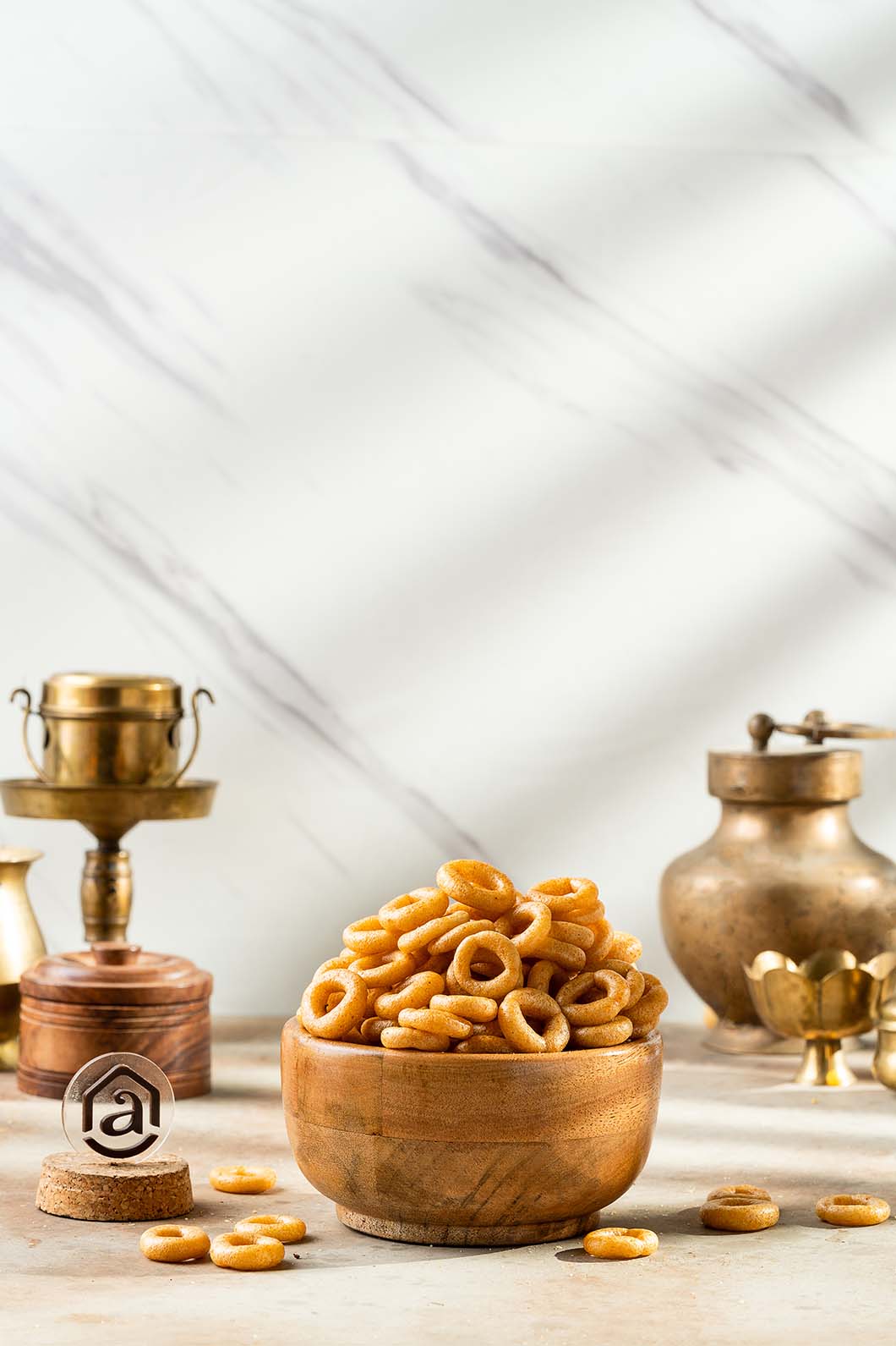Small ring murukku is popular among kids and is a definite must have staple if you have kids in the house. Made with rice flour and spiced to perfection with added crispiness to treat your tastebuds.