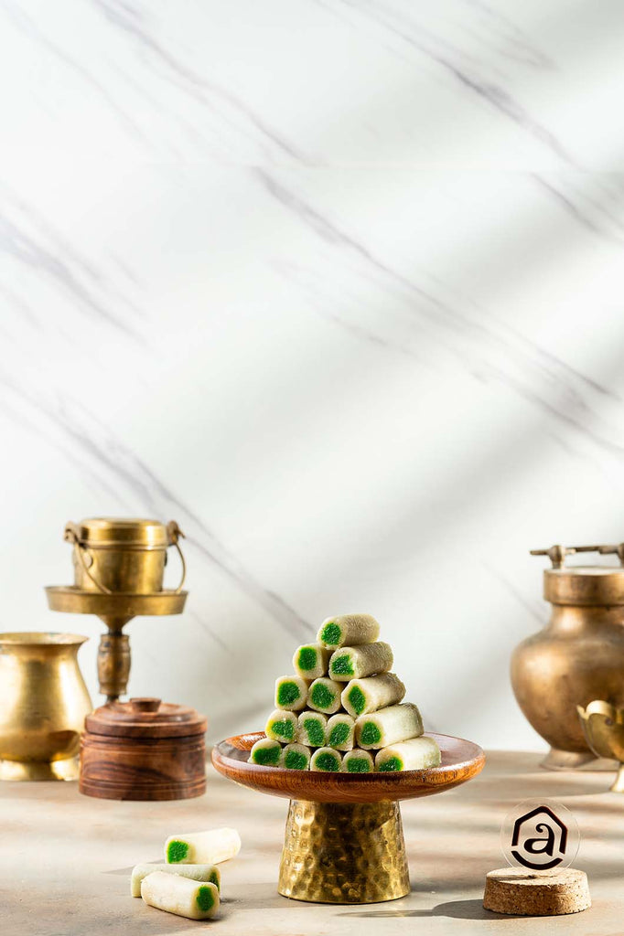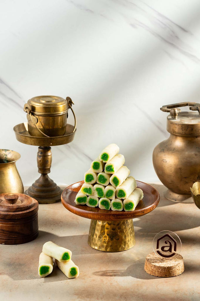 Decadent and delicious our Pista rolls are made from ground pistachios, enclosed in a soft cashew casing. Rich and indulgent, our Pista Rolls simply melt in your mouth with each bite.